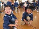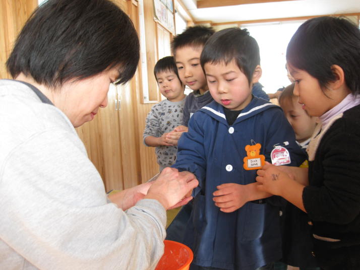 1月15日(水)小正月の伝統行事「だんごさし」を行いました。縦割りグループ毎に、赤や黄、白、緑の色が付けられた団子を丸めたり、飾りを折り紙で作ったりしました。団子や飾りは、ミズキの木につけて飾り、園舎のなかも一段と鮮やかになりました。