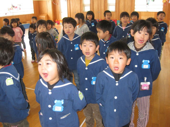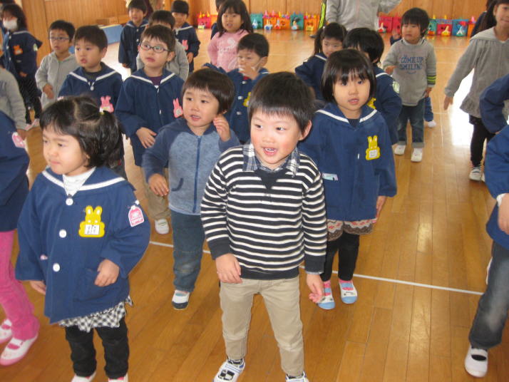 2月3日(月)節分まめまき会を行いました。紙芝居で節分の由来を知ったり、『鬼のパンツ体操』をみんなで楽しみました。まめまき会に合わせて制作していた“鬼のお面”と“豆入れ”を準備し、「鬼は外〜!福は内〜!」と豆まきをしていたところに、太鼓の音と同時に本物(?)の鬼が登場すると、一瞬にしてお遊戯室は悲鳴に変わりました。必死に逃げ回る子や先生にしがみついて離れない子、鬼に気付かず豆を拾っている子、果敢に豆を投げつける子など様々。最後には鬼は降参し、悪いものを全部持って逃げていきました。それぞれの心の中にいる“泣き虫鬼”や“怒りんぼ鬼”“わがまま鬼”などを退治することができました。