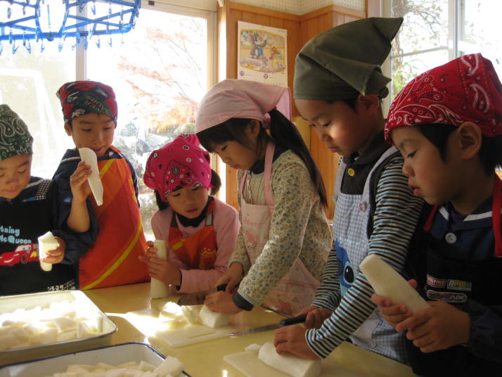 11月22日(金)光組が、自分たちで育てて収穫した大根を使って、おでん作りに挑戦しました。グループに分かれて、大根の皮むきをしたり、包丁を使ってちくわやこんにゃくを切ったりしました。お家でお手伝いをしている子が多く、包丁の使い方がとても上手でした。出来上がったおでんは、昼食の時間にみんなでいただきました。「おいしいね!」と、心も体も温まる1日でした。